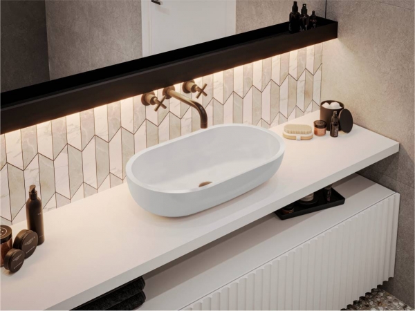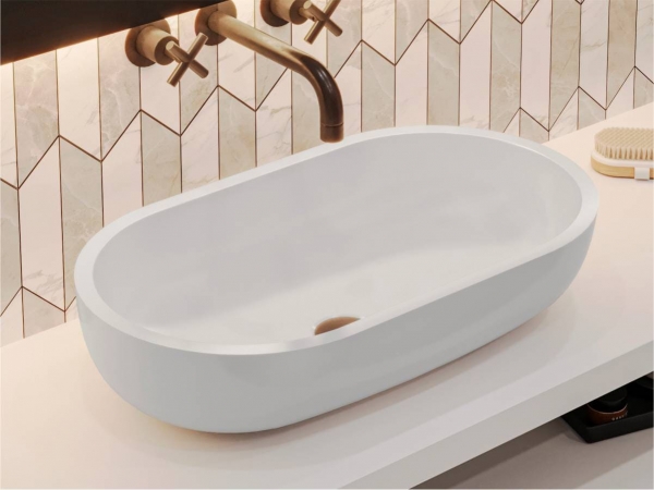 Овальний умивальник MARK 625 MIRAGGIO приваблива модель для середньої ванної кімнати. Видовжена раковина з товстими стінками стане акцентом в інтер'єрі будь-якого стилю. Передбачає окремий або настінний змішувач. Має накладний тип монтажу. Заводський стандарт моделі не передбачає отвори під змішувач та перелив. Умивальник виготовлено з міцного, гарного та сучасного продукту – литого мармуру (штучного каменю) з Miramarble technology – 80% мармурової крихти та 20% полімерної смоли з домішками, зовнішня поверхня виробу покрита антибактеріальним гелем Gelcoat ISO NPG, який захищає виріб від бактерій та механічних пошкоджень. На кінцевому етапі полірується спеціальною пастою для отримання блискучої глянсової поверхні. Литий мармур відрізняється здатністю поглинати звуки води та приймати температуру довкілля, завдяки цьому умивальник безшумний, зручний та надійний. Умивальник у ванній кімнаті може бути не просто функціональним предметом, а й стильним аксесуаром. Ексклюзивна сантехніка MIRAGGIO - вражає своїм неперевершеним дизайном, передовими технологіями та бездоганною якістю, де кожен елемент створений для того, щоб забезпечити Вам комфорт, естетику та незабутній досвід використання.
