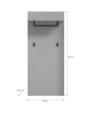 вішалка обладнана полицею для головних уборів, тремпелем для вішаків та двома гачками |