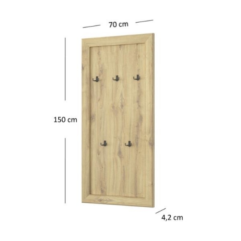 Вішак навісний 70 Sapori Mebel Bos в елегантному та стильному рішенні, додасть багатство та шарм інтер'єру передпокою. Вішак має п'ять гачків та призначений для навішування на стіну. Колекція зачарує Вас своїм дизайном; простими формами; дивовижним теплим кольоровим виконанням "дуб наварра"; декоративними рамами по периметру фасадів, надаючи масивності та елегантності; фірмовими комплектуючими. Меблі Сапорі Меблі Бос, безперечно, створять спокійну, гармонійну атмосферу, яка привнесе в інтер'єр почуття розслабленості та затишку.