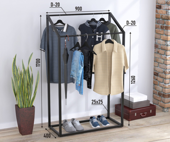 Вішалка-стійка для одягу SDO 6 Loft Design - розумне використання простору, де кожна деталь сприяє порядку та комфорту. Вона виглядає легко та акуратно, але всередині приховує продуману логіку зберігання, дозволяючи розмістити більше, ніж можна очікувати від такого компактного формату. Головна ідея - подвійна система штанг на різній висоті. Таке рішення допомагає природно розділити гардероб: довгі пальта та сукні залишаються у своїй зоні, а сорочки, штани або повсякденні речі зручно розташовуються поруч, не перекриваючи одна одну. У підсумку все видно відразу, і вибір займає лічені секунди. Дві паралельні поперечини фактично подвоюють корисний простір, не збільшуючи габарити. При ширині 90 см і глибині всього 40 см стійка легко вписується навіть у вузькі передпокої або компактні кімнати, зберігаючи відчуття вільного простору. Каркас виконаний з міцного металевого профілю 25×25 мм з матовим чорним порошковим покриттям - стійкий, надійний і візуально строгий. Нижня рама залишається відкритою і легкою, дозволяючи використовувати її як зручне місце для взуття або коробок, не перевантажуючи інтер'єр. Вішалка-стійка для одягу SDO 6 Loft Design, коли проста форма перетворюється на продумане рішення, роблячи зберігання легким, а простір - організованим і спокійним.