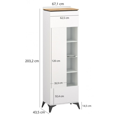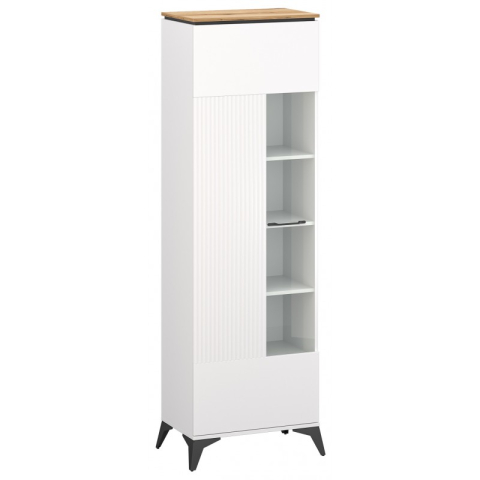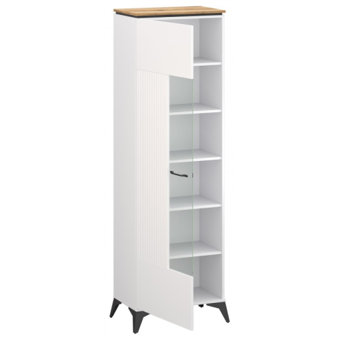 Вітрина 1W Velutto Mebel Bos - втілення витонченого стилю, де елегантність сучасного дизайну гармонійно поєднується з індустріальною естетикою, наповнюючи інтер'єр характером і затишком, прикрашаючи вітальню, їдальню, робочий кабінет і навіть дитячу, привносячи в атмосферу нотки вишуканості та натхнення. Вітрина містить одне закрите відділення зі зручними полицями та фасадом із прозорим загартованим склом, з можливістю доповнити конструкцію елегантним LED-підсвічуванням, наповнюючи простір м'яким і вишуканим світлом. Меблі привертають увагу елегантністю і гармонією, де декоративно виділена стільниця стає стильним візуальним акцентом, рельєфні фасади з тонкими вертикальними лініями надають меблям об'єму та витонченої вишуканості; металеві ніжки і ручки чорного кольору ідеально підкреслюють індустріальний стиль, а фірмові комплектуючі забезпечують плавність і безшумність роботи, даруючи задоволення від кожного дотику. Velutto Mebel Bos - меблі, які надихають і роблять дім по-справжньому затишним!