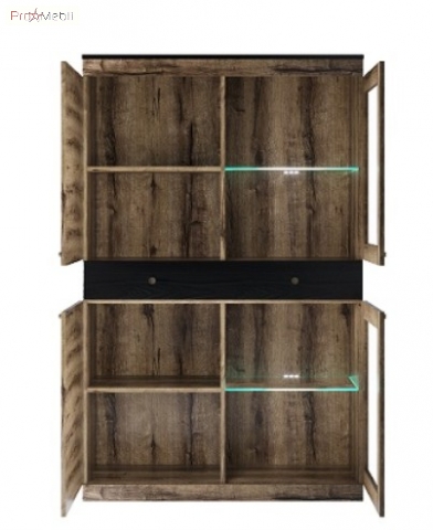 Вітрина 2D2W1S Jagger Mebel Bos - це містка практична шафа-буфет, яка вдало поєднує в собі функціональність і модний стильний дизайн і призначена для облаштування вишуканої вітальні або їдальні. У вашому розпорядженні одна висувна шухляда і чотири закритих відділення з однієї поличкою в кожному. Два відділення мають фасади зі вставкою з прозорого скла і по скляній поличці всередині, які додатково можуть комплектуватися енергозберігаючим світлодіодним підсвічуванням. Корпус і фасадні частини виготовлені з якісного ламінованого ДСП, в чудовому поєднанні легкого древесного малюнка «дуб монастирський» з чорними вставками декору. Меблі Джаггер Mebel Bos привертають увагу своїм стилем; оригінальним поєднанням кольорів; дизайнерськими металевими ручками під бронзу двох видів; фірмовими комплектуючими: завіси з функцією тихого закриття і кульковими направляючими повного висування забезпечують максимальний комфорт у використанні. Колекція Джаггер Меблі Бос об'єднає ритм повсякденного життя з домашнім затишком, створюючи новий подих свіжості в атмосфері Вашого будинку.