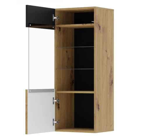 Елегантна навісна вітрина Зара Світ Меблів поєднує в собі сучасні, лофтові та індустріальні елементи, створюючи стильну і затишну атмосферу у вітальні, наповнюючи простір динамікою і натхненням, роблячи інтер'єр сучасним і виразним. Вітрина оснащена закритим відділенням з елегантною вставкою із загартованого скла, усередині розташовані зручні полички, що забезпечують практичне зберігання й естетичне розміщення предметів. Вітрина доступна в правосторонньому і лівосторонньому виконанні, що робить її універсальним рішенням для будь-якого інтер'єру. Особливої чарівності вітрині надають виражені на фасадах вертикальні планки з шовкографії; контрастне поєднання відтінків, теплий відтінок «дуб артізан» з його природною текстурою гармонійно поєднується з глибоким насиченим «антрацитом»; сучасна система відкривання Push to Open; надійна фурнітура, що забезпечує плавність і комфорт в експлуатації. Меблі Зара Світ Меблів створять затишний і продуманий простір, де кожна деталь сприяє створенню гармонійного й сучасного інтер'єру, сповненого комфортом і атмосферою тепла, в якому приємно відпочивати й проводити час.
