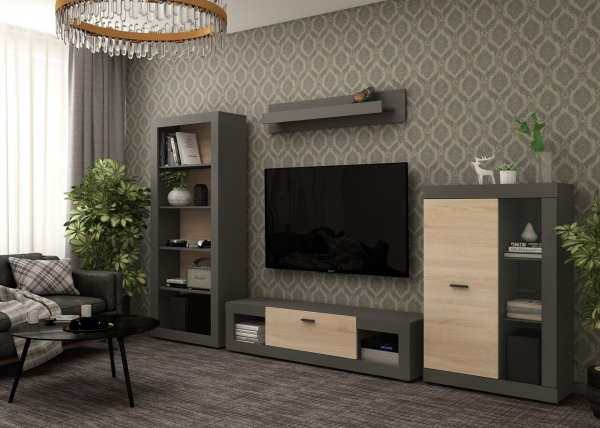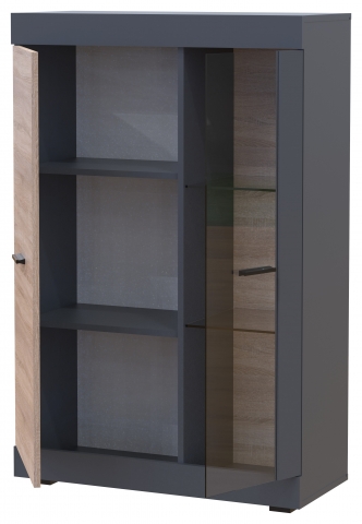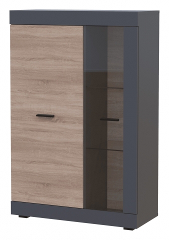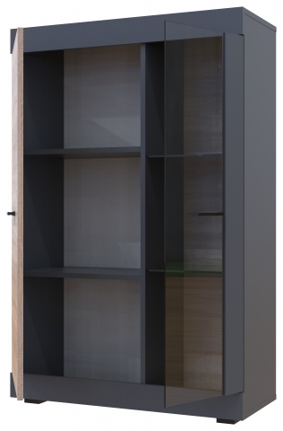 Витончена вітрина низька 1 ДСП / 1 скло Дана Doros, допоможе створити простір, який буде візуально привабливим та зручним для всіх, хто відвідує вітальню. Вітрина має два закритих відділення, за лівою орною дверцею зі вставкою з прозорого загартованого скла розташовані дві скляні полки, за правою орною дверцею встановлені дві дерев'яні полиці, що чудово підійде для зберігання або демонстрації різних предметів або цінних речей. Вітрина виготовляється з ламінованого ДСП (Kronospan) товщиною 16 мм у поєднанні протилежних відтінків: елегантного та загадкового кольору "графіт" з теплим та заспокійливим відтінком деревної текстури "дуб сонома". Модульні меблі Дана Doros поєднує різні елементи, створюючи унікальний та неповторний інтер'єр.