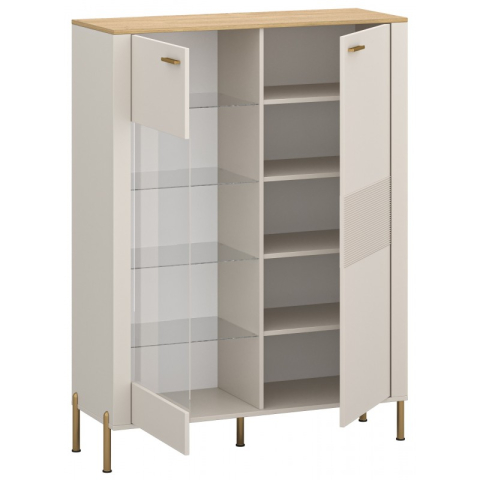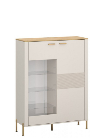 Вітрина низька 1D1W Ruben Mebel Bos - симфонія витонченого стилю, розкоші та комфорту, що додасть вітальні, їдальні, робочому кабінету елегантності та гармонії, перетворюючи інтер'єр на простір мрії. Елегантна низька вітрина оснащена двома закритими відділеннями зі зручними полицями для зберігання. Ліве відділення привертає увагу фасадом зі вставкою з прозорого загартованого скла, за яким розташовані чотири витончені скляні полиці. Вони створюють ідеальний простір для демонстрації посуду, декору або колекційних предметів і можуть бути додатково оснащені LED-підсвічуванням, що надає експозиції виразності. Праве відділення з глухим фасадом приховує систему закритих полиць, що забезпечує акуратність і порядок у зберіганні. Колекція заворожує з першого погляду втіленням естетики та стилю: теплий відтінок «кашемір» наповнює простір відчуттям спокою й умиротворення, перетворюючи інтер'єр на оазис затишку; стільниці у відтінку «дуб кам'яний» ефектно вирізняються на світлому тлі, створюючи виразний акцент і підкреслюючи стильне подавання декору; витончені рифлені декоративні елементи надають поверхням об'єму та глибини, граючись із тінями та світлом; розкішні золотисті ручки стануть елегантною прикрасою, що підкреслює шляхетний стиль колекції; легкі й витончені ніжки золотого кольору надають конструкції легкість, зберігаючи водночас неперевершену стійкість і надійність, а високоякісна фурнітура забезпечує плавність і безшумність роботи, даруючи задоволення від кожного дотику. Ruben Mebel Bos справжній витвір мистецтва, що створює простір, в якому кожна деталь надихає, а комфорт стає мистецтвом!