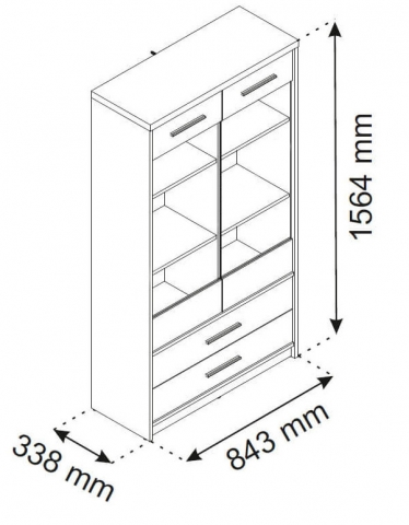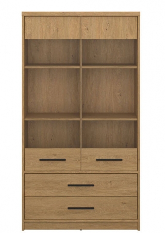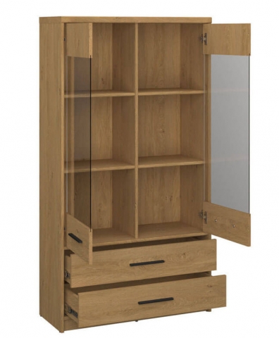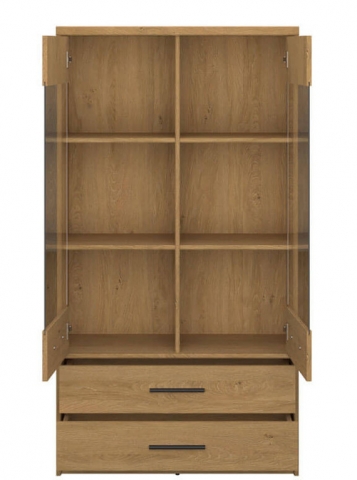 вітрина містить дві висувні шухляди та два закриті відділення: за кожними дверима зі скляною вставкою розташовані дві полиці |