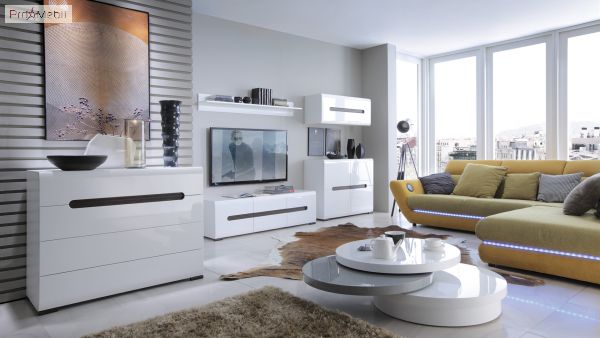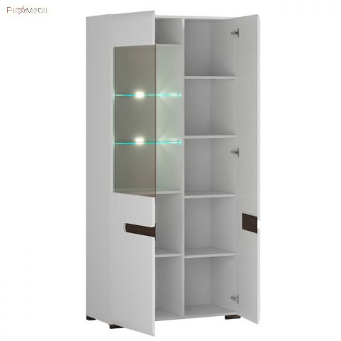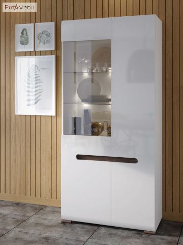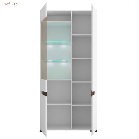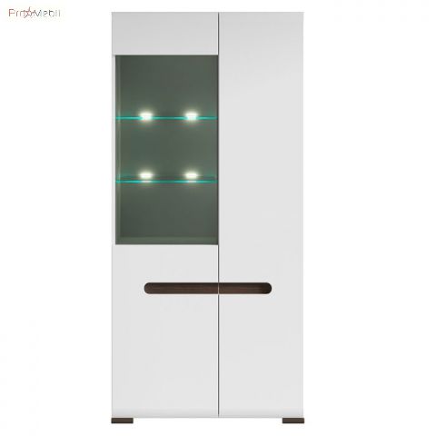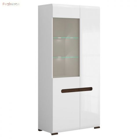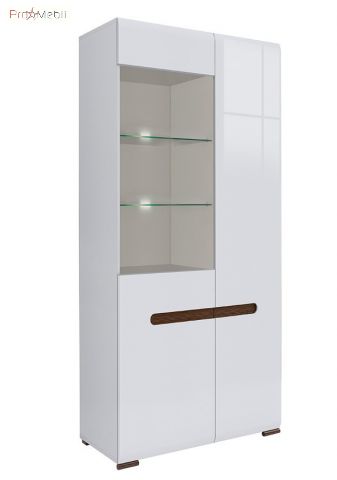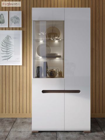 Вітрина REG1W1D/21/9 Ацтека ВМК (БРВ) у кольорі білий глянець із колекції модульних меблів української фабрики BRW (БРВ Україна). Багатофункціональний елемент вітальні та їдальні для зберігання посуду, книг та декору. Висока містка вітрина має два відділення за дверцятами, праворуч дверцята комбіновані з МДФ і прозорого скла, внутрішній простір за якою розділено скляними поличками з підсвічуванням та поличками з ДСП, зліва - глухі дверцята з МДФ та полички з ДСП. Головними особливостями моделі є прості геометричні форми, закруглені краї фасадів, оригінальні ніжки та відсутність ручок. Їхню роль виконують відфрезеровані на фасадах виїмки контрастного кольору венге магія у формі еліпса. Вітрина оснащена прозорим склом і комплектується прихованим інтер’єрним світлодіодним підсвічуванням. Використовується фурнітура європейського виробника Hettich з дотягом, що забезпечує плавне закриття дверей. До асортименту модульної системи увійшли елементи для облаштування всього будинку в єдиному стилі: вітальні, їдальні, спальні, дитячої, домашнього кабінету та офісу. Сміливі ефектні меблі Ацтека БРВ підійдуть для найвибагливіших клієнтів і порадують своїх власників високою якістю матеріалів та фурнітурою, а також довговічністю та функціональністю у використанні.