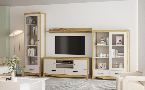 Незвичайно зваблива і сучасна вітрина REG1W2S Дана Gerbor одразу підкорює серце не тільки своїм естетично бездоганним зовнішнім виглядом, а й широкими функціональними можливостями для облаштування затишної вітальні. Вітрина містить дві висувні шухляди і два відділення: одне відкрите відділення з полицями, друге закрите відділення, де за дверима зі вставкою з прозорого скла розташовані полиці для акуратного зберігання предметів. Вітрина зачаровує плавною геометрією, теплим відчуттям ґрунтовності, акуратними чорними ручками, легкими різьбленими цоколями і витонченими ніжками, наповнюючи інтер'єр світлом, затишком і елегантною гармонією. Колекція Дана Gerbor немов запрошує зупинитися на мить, вдихнути атмосферу затишку і насолодитися бездоганним комфортом, який надихає жити, мріяти і радіти кожному моменту.