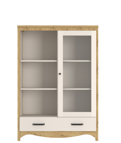 вітрина містить дві висувні шухляди і два відділення: одне відкрите відділення з полицями, друге закрите відділення, де за дверима зі вставкою з прозорого скла розташовані полиці |