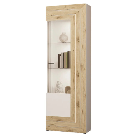 Елегантна вітрина висока 1Д Джейкоб біла Сокме, в якій виразний дизайн і гармонія контрастів втілюються в сучасному образі затишку, свіжості та бездоганного смаку. Вітрина містить одне закрите відділення з поличками всередині для зручного зберігання та раціональної організації простору. Родзинкою колекції є витонченість і елегантність; вишуканий баланс чистої світлої естетики з природною натуральністю дерева; прямі лінії і лаконічні геометричні форми; акуратні тонкі ручки чорного кольору, що підкреслюють сучасний акцент; міцна основа з невеликими ніжками, що сприяє максимальній стійкості; високоякісна фурнітура. Джейкоб Сокме - меблі з характером, в яких продуманий кожен штрих, створюючи простір, наповнений світлом, легкістю і сучасним затишком, де кожна деталь відображає витонченість, гармонію і почуття стилю.
