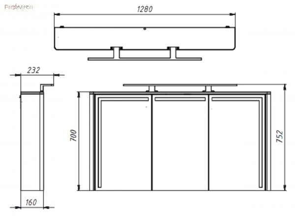 дзеркальна шафа має три відділення, внутрішній простір яких, в свою чергу, розділено скляними полицями товщиною 5 мм, які регулюються по висоті |