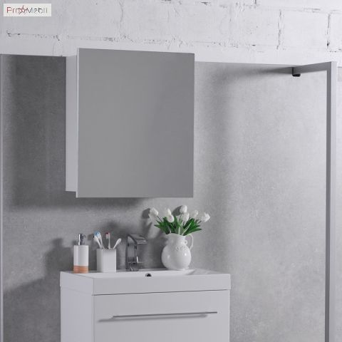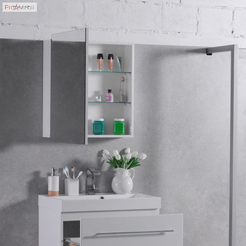 Ідеальна дзеркальна шафа MC-700 (ШЗ-700) Fancy Marble дуже актуальна для ванної кімнати, дзеркало зробить ванну кімнату яскравіше і збільшить внутрішній простір приміщення. У своїй конструкції дзеркальна шафа має одне закрите відділення, простір розділено скляними полицями. Корпус і фасадні частини виготовлені з МДФ товщиною 16 мм, поверхня меблів покрита вологостійкою ПВХ-плівкою. Акуратна шафа виконана в класичному кольорі білий глянець, з можливістю виготовити в кольорі білий матовий і графіт матовий. Головною особливістю є вологостійке полотно, призначене для експлуатації в приміщеннях з підвищеною вологістю; стриманий і унікальний дизайн; динамічні лінії, прямокутні форми; відсутність ручок, їх роль виконує торець фасаду; система «Soft close», яка забезпечує плавне і м'яке закривання. Fancy Marble - уособлення по-справжньому високої якості, витонченого дизайну і відмінною функціональності.
