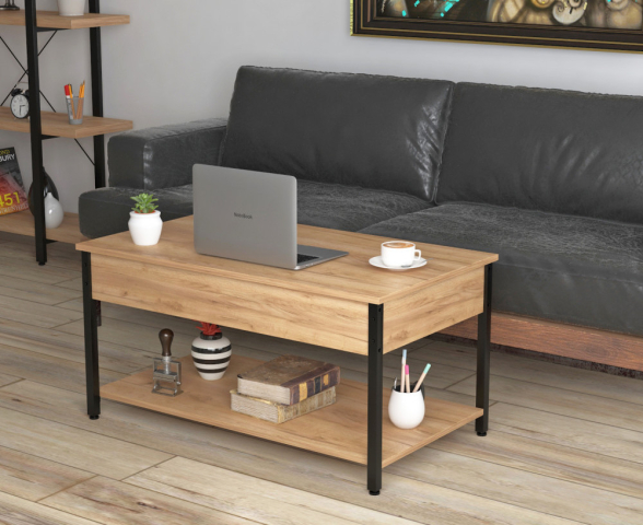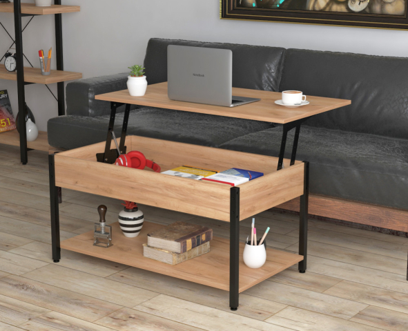 Журнальний стіл L-5 Slider Loft Design справжній майстер гри з простором, створений для тих, хто любить поєднувати естетику і функціональність. Унікальна підйомна стільниця відкриває нові горизонти комфорту: всього одним легким рухом ви перетворюєте стильний журнальний столик в зручний робочий або обідній стіл прямо біля дивана. Уявіть, як приємно насолодитися ранковою кавою, працюючи з ноутбуком, або влаштувати швидкий перекус, не встаючи з улюбленого крісла. Плавний, майже безшумний механізм підйому фіксує стільницю на потрібній висоті, перетворюючи буденні моменти в справжній ритуал затишку. Під стільницею заховано містке приховане відділення — ваша секретна комора для всього, що має бути під рукою. Доповнює функціональність відкрита нижня полиця, де можна розмістити журнали, декоративні подушки або навіть кошики з речами. Стіл виконаний з ламінованого ДСП з текстурою дорогого дерева, що надає інтер'єру теплоту і затишок. А металеві елементи підкреслюють сучасний характер і надають конструкції надійність. Регульовані ніжки дбають про вашу підлогу і дозволяють встановити столик ідеально рівно навіть на нестабільних поверхнях. У піднятому положенні стільниця витримує до 10 кг, залишаючись стійкою і безпечною. L-5 Slider легко підлаштовується під ваші звички, настрій і ритм життя, наповнюючи кожен день нотками зручності і натхнення. L-5 Slider Loft Design справжній must-have для тих, хто цінує стиль, любить затишок і хоче максимально використовувати простір. З L-5 Slider ваш будинок заграє новими гранями затишку і практичності, перетворивши навіть найменшу кімнату в продуманий і гармонійний простір.