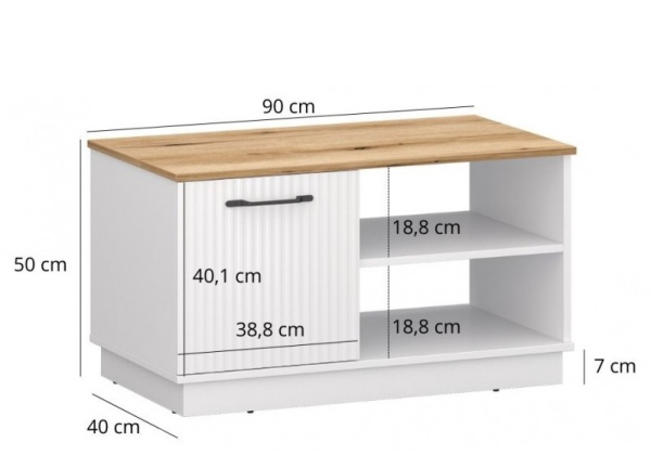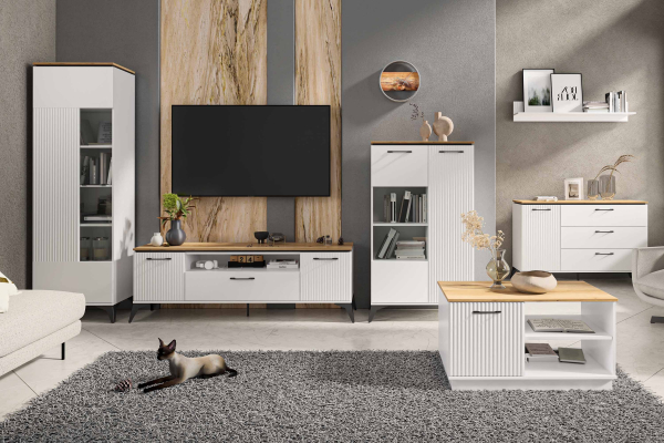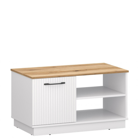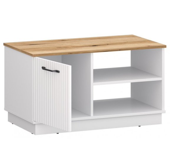 Журнальний столик 1D Velutto Mebel Bos - втілення витонченого стилю, де елегантність сучасного дизайну гармонійно поєднується з індустріальною естетикою, наповнюючи інтер'єр характером і затишком, прикрашаючи вітальню, привносячи в атмосферу нотки вишуканості та натхнення. Журнальний столик прямокутної форми оснащений додатковими функціональними поличками і закритим відділенням для зберігання, що дає змогу зручно розмістити книжки, журнали та інші необхідні дрібниці. Меблі привертають увагу елегантністю і гармонією, де декоративно виділена стільниця стає стильним візуальним акцентом, рельєфні фасади з тонкими вертикальними лініями надають меблям об'єму та витонченої вишуканості; металеві ручки чорного кольору ідеально підкреслюють індустріальний стиль, а фірмові комплектуючі забезпечують плавність і безшумність роботи, даруючи задоволення від кожного дотику. Velutto Mebel Bos - меблі, які надихають і роблять дім по-справжньому затишним!