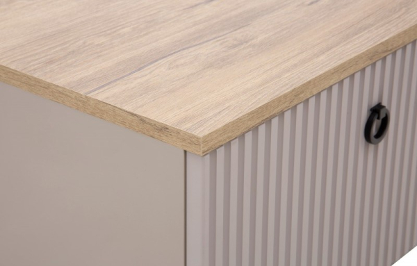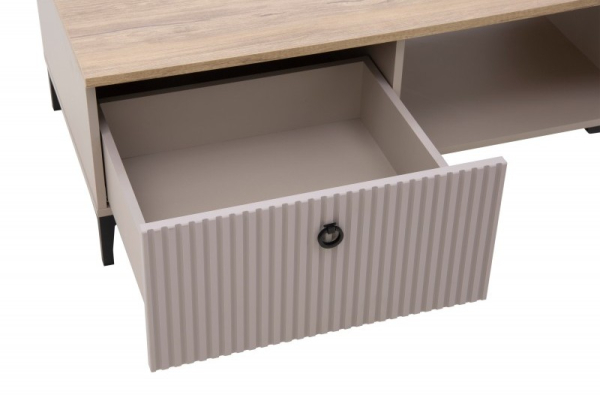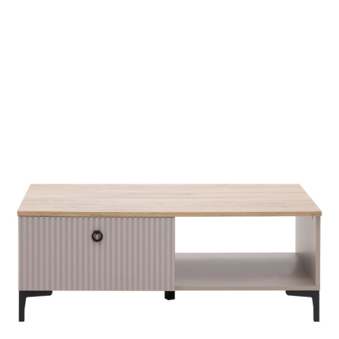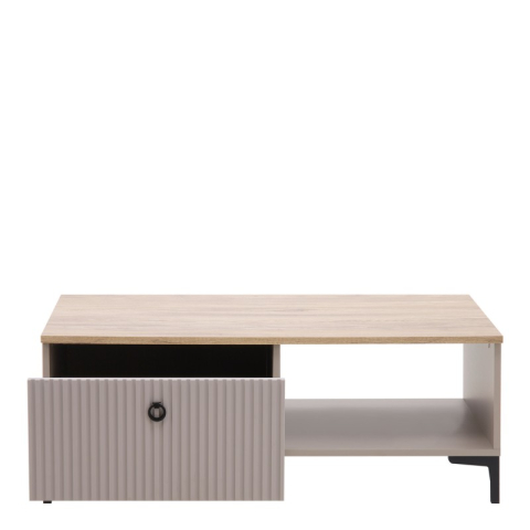 Журнальний столик 1S Dominica Mebel Bos справжній шедевр витонченого стилю й елегантності, що ідеально підходить для створення затишної та функціональної атмосфери у вітальні, їдальні та робочому кабінеті. Журнальний столик оснащений функціональною поличкою і висувною шухлядою для зберігання, що робить його зручним і практичним елементом інтер'єру. Столик приваблює своїм сучасним мінімалізмом; гладким корпусом з ребристими фасадами, що створює тактильну глибину; чорними металевими ручками-кнокерами, що додають індустріальний шарм; Г-подібними пластиковими ніжками - легкість та міцність, а фірмові комплектуючі, кулькові напрямні повного висування, забезпечують довговічність та функціональність меблів. Колекція Домініка Меблі Бос - це комплексне рішення для створення затишного і сучасного інтер'єру з акцентом на стиль і практичність.
