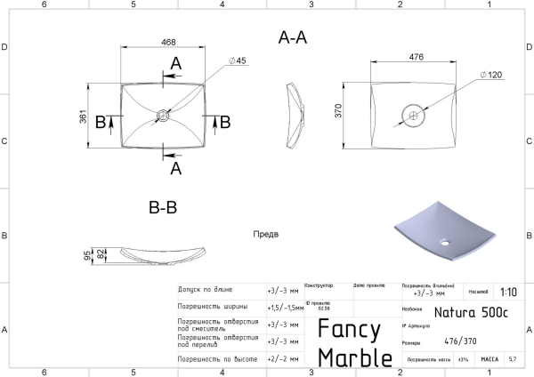 Технические характеристики Умывальник Natura 480 Matt Fancy Marble