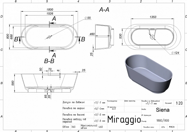 Ванна SIENA MIRAGGIO покорит ваши сердца и подарит вам множество удовольствия. Спроектирована таким образом, чтобы вы могли долго принимать ванную и вам было действительно комфортно, даже вдвоем. Ванна изготовлена из прочного, красивого и современного продукта – литого мрамора (искусственного камня) с Miramarble technology – 80% мраморной крошки и 20% полимерной смолы с примесями, наружная поверхность изделия покрыта антибактериальным гелем Gelcoat ISO NPG, который защищает изделие от бактерий и механических повреждений. На конечном этапе ванна полируется специальной пастой для получения блестящей глянцевой поверхности. Ванна Siena Miraggio овальной формы с идеальными габаритами, компактная, сифон прячется в "юбке", создавая воздушную подушку, способствующую сохранению тепла воды, выпускается в белом цвете с глянцевой поверхностью и с возможностью окрашивания снаружи в любом цвете по палитре RAL. Ванна – это не просто сантехника, это проявление любви к себе, чтобы действительно насладиться жизнью и уделить время на себя, потому что прием ванны – это волшебный обряд. MIRAGGIO – комфорт и удобство в каждой детали.