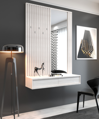 Описание Вешалка настенная с зеркалом и ящиками Дели ясень снежный Gerbor