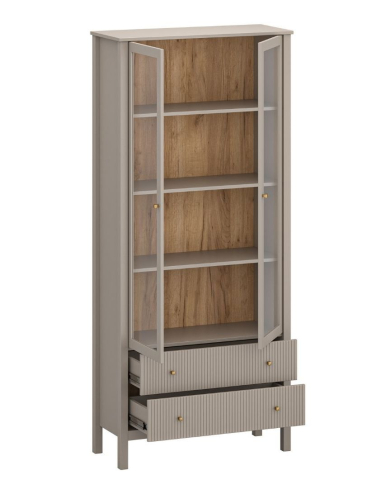 Витрина 2W2S Kleo Mebel Bos настоящее воплощение стиля, роскоши и элегантности, превращающее любой интерьер — будь то гостиная, спальня, детская или офис — в изысканное пространство, наполненное теплом и уютом, где каждая деталь уникального дизайна становится акцентом, который привлекает внимание и создает атмосферу гармонии и красоты. Витрина оснащена двумя выдвижными ящиками и закрытым отделением, внутри которого расположены три полочки, что предоставляет достаточно места для хранения различных предметов. Верхний фасад украшен вставкой из прозрачного стекла, придавая витрине лёгкость и изысканность, а для дополнительного комфорта и создания уютной атмосферы витрина может дополнительно быть оснащена подсветкой, которая подчеркивает её стиль и добавляет элемент роскоши. Мебель поражает изысканной эстетикой, создавая атмосферу, в которой невозможно не задержаться; тонкая фрезеровка на фасадах придает мебели необыкновенную глубину и текстурность; золотистые металлические ручки становятся не просто акцентом, а настоящим элементом стиля, подчеркивая современный характер коллекции; высокие ножки придают мебели легкость и элегантность, визуально расширяя пространство и создавая ощущение воздушности в интерьере; фирменные комплектующие, обеспечивают плавность и бесшумность работы, принося удовольствие от каждого прикосновения. Kleo Mebel Bos — ваш идеальный стиль жизни.