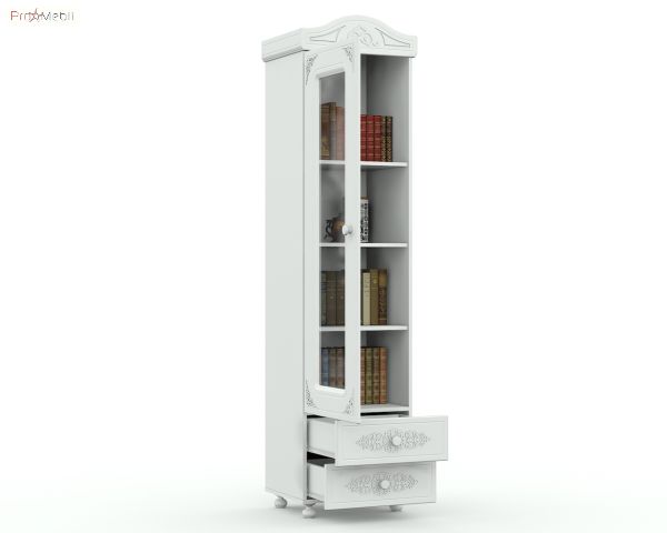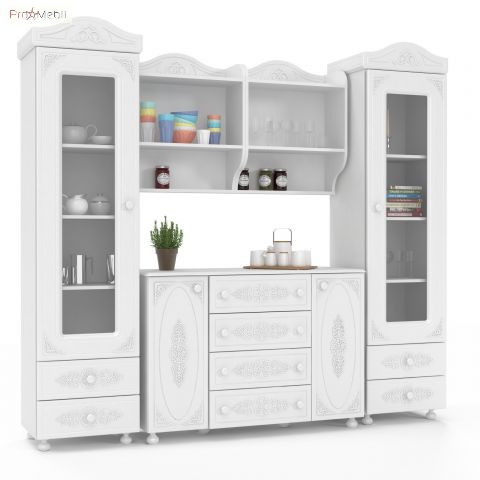 Вместительная витрина АС-01 Белль Санти прекрасно дополнит интерьер гостиной, столовой, детской комнаты. Витрина АС-01 Белль Santi содержит два выдвижных ящика и одно закрытое отделение со стеклянным фасадом и с тремя полками внутри. Дверь может навешиваться как с правой, так и с левой стороны. Корпус изготавливается из ламинированной ДСП толщиной 16 мм немецкого концерна «Kronospan», фасад – из МДФ с технологией нанесения объемного рисунка 3D. Торцы деталей оклеиваются ПВХ-кромкой фирмы Rehau. Мебель Белль Санти выпускается в нежном цвете «белое дерево» со структурой дерева. Характерными особенностями мебели Белль Santi является изящный дизайн, объемные ажурные узоры на фасадах, декоративные карнизы интегрированные в корпус, фигурные ручки и ножки из натурального дерева, фирменные петли немецкого концерна Hettich и телескопические направляющие полного выдвижения. Мебель Белль Santi это способ уникальной аранжировки интерьера с уникальным, сказочно красивым дизайном.