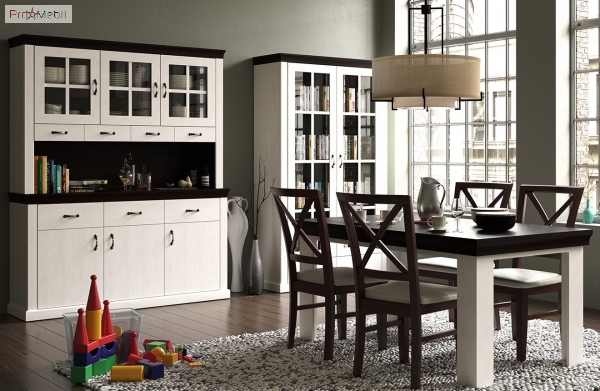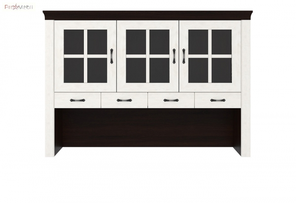 Витрина-надставка 3W4S Лавенда ВМВ экстравагантная стильная мебель с эффектным дизайном, предназначена для обустройства изысканной гостиной или столовой. Надставка в сочетании с успешно подобранными комодом 3D3S способна кардинально преобразить интерьер, заставить заиграть его яркими красками. Витрина-надставка содержит три закрытых отделения со вставкой из тонированного закаленного стекла и четыре выдвижных ящика. Корпус и фасадные части изготавливаются из высококачественного ламинированного ДСП Kronospan толщиной 16 мм в сочетании контраст светлых корпусов и фасадов в цвете сосна норвежская с темными горизонтальными поверхностями цвета дуб шоколадный. Витрина привлекает внимание эффектным дизайном; утолщенными боковинами; выступающими карнизами; стилизованными под ковку полукруглыми металлическими ручками с рельефными креплениями; фирменными комплектующими, которые обеспечивают максимальное удобство в использовании. Мебель LavendaVMV очарует вас своим особым шармом стиля прованс, преобразив интерьер и подчеркнув колорит.