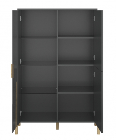 витрина содержит три закрытых отделения: за левой дверью со вставкой из тонированного стекла расположены три стеклянных полки, в других отделениях находится по одной полке |