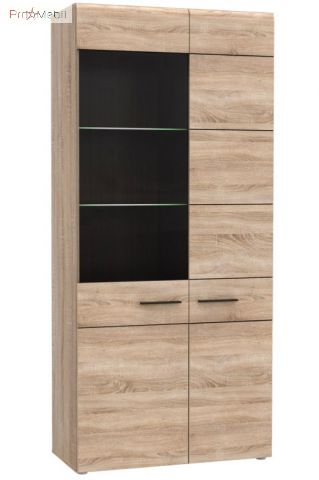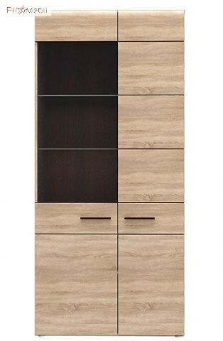 Витрина высокая 1W1D из коллекции модульной мебели Соло украинской фабрики VMV. Асимметричная витрина имеет две дверки, за которыми полочки. Прозрачное стекло и полочки из закаленного стекла выгодно подчеркнут содержимое витрины и придадут интерьеру гостиной более изысканный вид. Главной особенностью являются теплый цвет, простые геометрический формы, закругленные края и декоративные вставки в цвете венге, разделяющие фасад на отдельные блоки. Фасад дверок украшают длинные прямоугольные ручки.