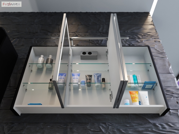 зеркальный шкаф имеет три отделения, внутреннее пространство которых, в свою очередь, разделены стеклянными полочками толщиной 5 мм, регулируемых по высоте |