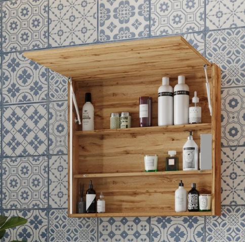 Зеркальный шкаф в ванную комнату QnMC-65 Queen Ювента - изысканное и практичное решение, которое гармонично сочетает в себе современный дизайн и функциональность, добавляет удобное место для хранения, и становится стильным акцентом в интерьере. Конструкция шкафа продумана до мелочей: одна открытая полка позволяет держать под рукой самые необходимые мелочи, а за дверцей, которая открывается вверх, скрывается аккуратное пространство с двумя полками из ламинированного ДСП. Здесь удобно хранить косметику, средства для ухода и другие аксессуары, поддерживая порядок и чистоту в помещении. Две боковые LED-подсветки мягко и равномерно освещают зеркало, создавая приятное, расслабляющее свечение. Внутри шкафа предусмотрены розетка и выключатель, что делает его функциональным и максимально удобным в повседневном использовании. Корпус и фасад выполнены из прочного ламинированного ДСП толщиной 16 мм, дополненного зеркальным полотном, а теплый оттенок дуба вотан в отделке корпуса привносит в интерьер ощущение уюта и природной гармонии, а минималистичное решение без традиционных ручек - роль которых выполняет нижний торец фасада - подчеркивает современный стиль изделия. Зеркальный шкаф Queen Ювента позволит Вам оформить интерьер ванной так, как Вы давно мечтали.