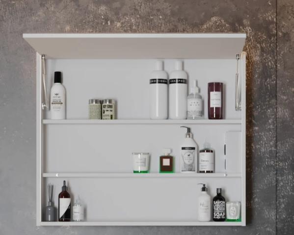 Зеркальный шкаф в ванную комнату QnMC-80 Queen Ювента - изысканное и практичное решение, которое гармонично сочетает в себе современный дизайн и функциональность, добавляет удобное место для хранения и становится стильным акцентом в интерьере. Конструкция шкафа продумана до мелочей: одна открытая полка позволяет держать под рукой самые необходимые мелочи, а за дверцей, которая открывается вверх, скрывается аккуратное пространство с двумя полками из ламинированного ДСП. Здесь удобно хранить косметику, средства для ухода и другие аксессуары, поддерживая порядок и чистоту в помещении. Две боковые LED-подсветки мягко и равномерно освещают зеркало, создавая приятное, расслабляющее свечение. Внутри шкафа предусмотрены розетка и выключатель, что делает его функциональным и максимально удобным в повседневном использовании. Корпус и фасад выполнены из прочного ламинированного ДСП толщиной 16 мм, дополненного зеркальным полотном, в безупречном белоснежном оттенке, наполняя интерьер свежестью, светом и визуальной легкостью, а минималистичное решение без традиционных ручек - роль которых выполняет нижний торец фасада - подчеркивает современный стиль изделия. Зеркальный шкаф Queen Ювента позволит Вам оформить интерьер ванной так, как Вы давно мечтали.