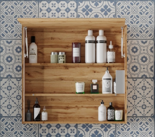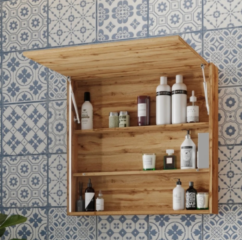 Зеркальный шкаф в ванную комнату QnMC-80 Queen Ювента - изысканное и практичное решение, которое гармонично сочетает в себе современный дизайн и функциональность, добавляет удобное место для хранения, и становится стильным акцентом в интерьере. Конструкция шкафа продумана до мелочей: одна открытая полка позволяет держать под рукой самые необходимые мелочи, а за дверцей, которая открывается вверх, скрывается аккуратное пространство с двумя полками из ламинированного ДСП. Здесь удобно хранить косметику, средства для ухода и другие аксессуары, поддерживая порядок и чистоту в помещении. Две боковые LED-подсветки мягко и равномерно освещают зеркало, создавая приятное, расслабляющее свечение. Внутри шкафа предусмотрены розетка и выключатель, что делает его функциональным и максимально удобным в повседневном использовании. Корпус и фасад выполнены из прочного ламинированного ДСП толщиной 16 мм, дополненного зеркальным полотном, а теплый оттенок дуба вотан в отделке корпуса привносит в интерьер ощущение уюта и природной гармонии, а минималистичное решение без традиционных ручек - роль которых выполняет нижний торец фасада - подчеркивает современный стиль изделия. Зеркальный шкаф Queen Ювента позволит Вам оформить интерьер ванной так, как Вы давно мечтали.